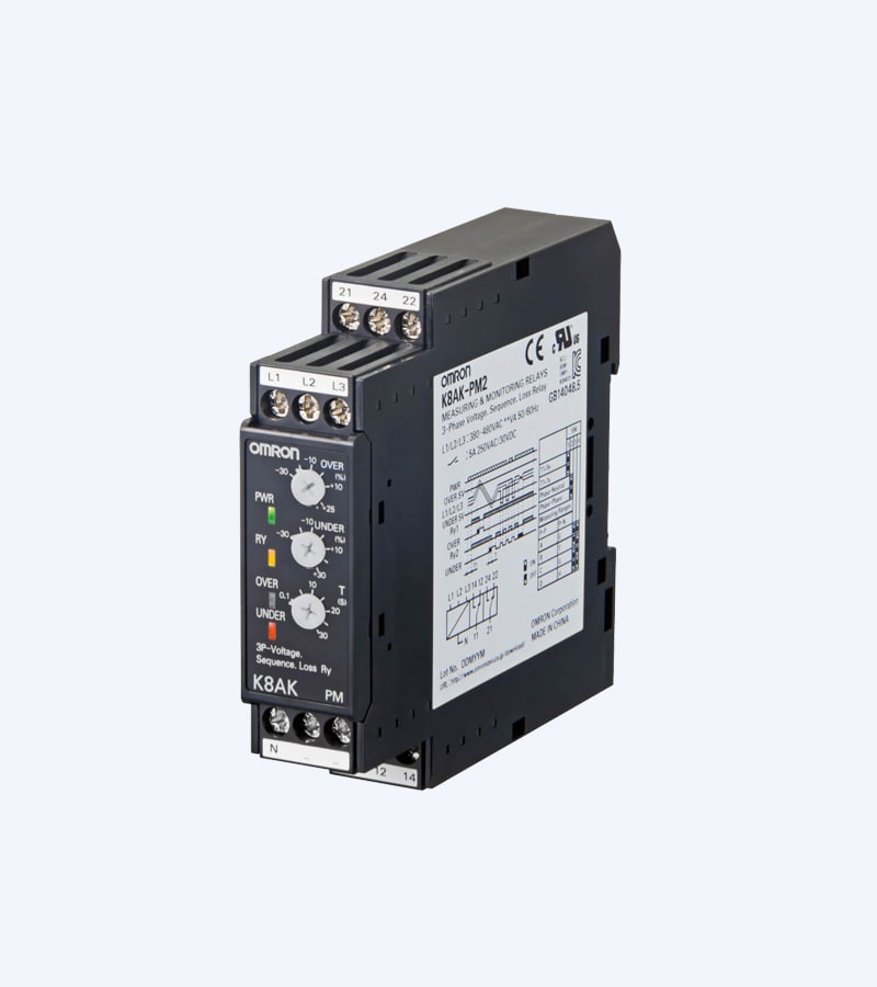 کنترل فاز K8AK-PM2 مناسب برای نظارت بر منابع تغذیه سه‌فاز برای تجهیزات و تاسیسات صنعتی است. این رله می‌تواند جلوگیری از خسارات ناشی از قطع فاز، تغییر ترتیب فاز یا نوسانات ولتاژ را به عمل آورد. همچنین، این رله مصرف انرژی را کاهش می‌دهد و عمر تجهیزات را افزایش می‌دهد.